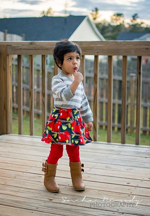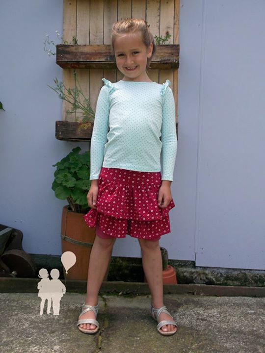 The original style option I came up with for the Skip Skirt was as shown above by Alison Daines that has been paired with the Fun Tee PDF Pattern. It is a cute 2 tier 1/2 circle skirt a style my girls adore wearing. As I started putting the pattern together I became inspired to offer other options that could also attach to the the yoke and offer more options, within the one pattern, that could look great being worn with our Fun Tee.