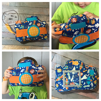 A PDF sewing pattern for a camera toy by Swoodsen Says, with both neck strap and wrist strap options. A small vinyl pocket on the back allows you to slip in pictures for a ‘view-finder’ to use in pretend play. Perfect as a softie for a baby or infant OR a prop for dress-up & imaginative play for an older child.